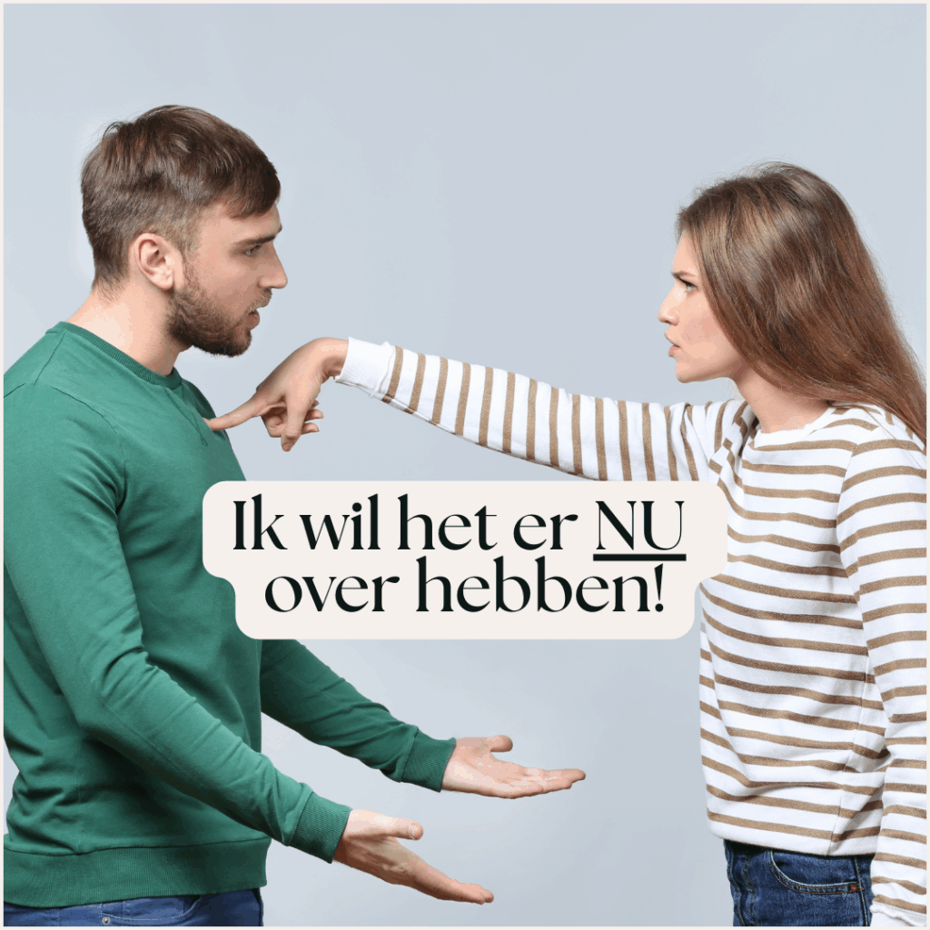 “Ik hoor dat dit voor jou nú belangrijk is. Tegelijkertijd voel ik dat ik op dit moment niet in staat ben om goed te reageren. Laten we dit gesprek even parkeren – ik wil het niet uitstellen, maar ik wil wel dat het constructief is.”